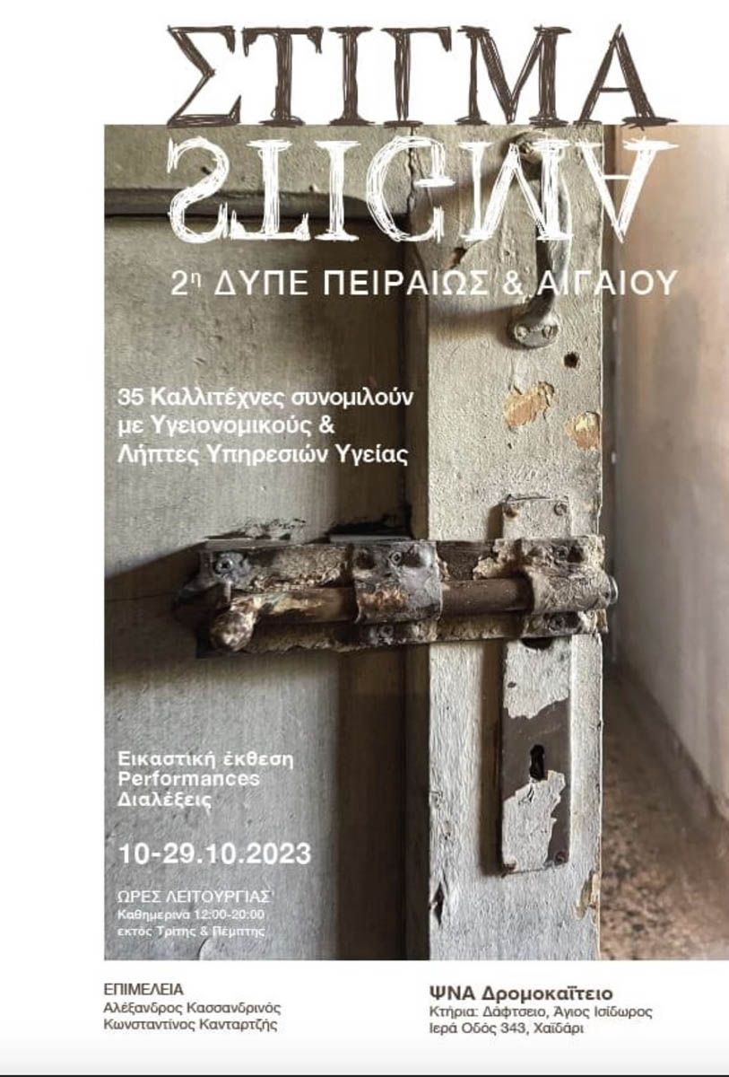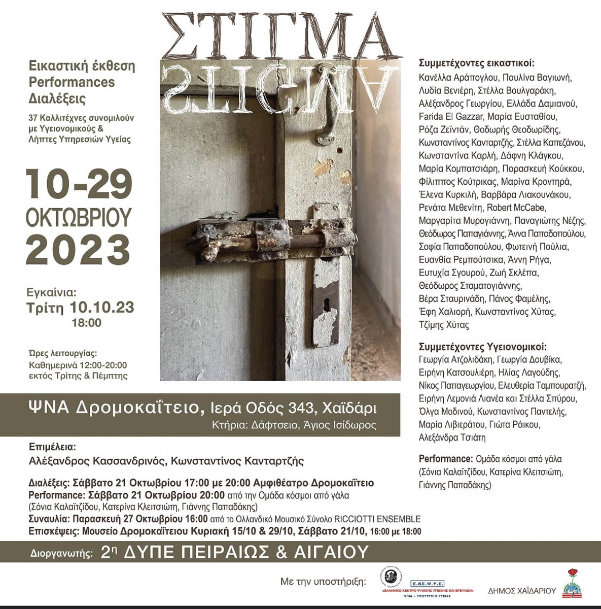 Starting from the position that no characteristic is inherently derogatory, but that its negative reception is a consequence of social processes, at this year's symposium on art and health, the 2nd Health Region of Piraeus and the Aegean cooperates with distinguished visual artists and organizes, among others, in the emblematic spaces of the Psychiatric Hospital of Attica "Dromokaiteio" (Agios Isidoros and Daftsio) a group exhibition entitled "Stigma/Stigma" curated by Alexandros Kassandrinos and Konstantinos Kantartzis.