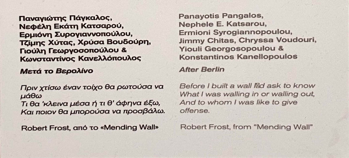 Nephele E. Katsarou, Yiouli Georgosopoulou, Jimmy Chitas, Criscia Voudouri, Ermioni Syrogiannopoulou, Konstantinos Kanellopoulos. Before I built a wall I’d ask to know what I was walling in and walling out, and to whom I was like to give offense. (Robert Frost, from “Mending Wall”).