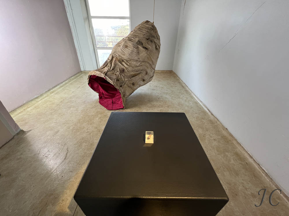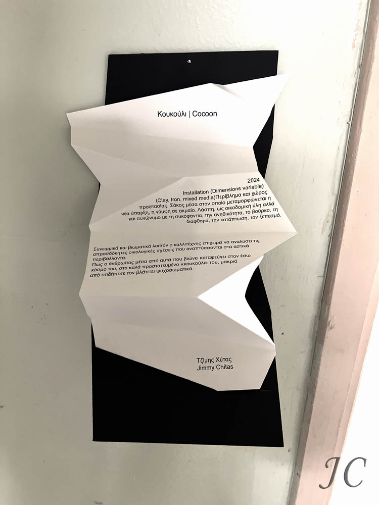 Enclosure and protection area. Sac in which the new being is transformed, the nymph into a bloomer. Mud, as a building material but also synonymous with slander, immorality, filth, corruption, forfeiture, decay. By association and experientially, the artist attempts to analyze the unexpected ecological relationships that develop in urban environments. How man, through what he experiences, takes refuge in his inner world, in his well-protected "cocoon", away from anything that harms him psychosomatically.