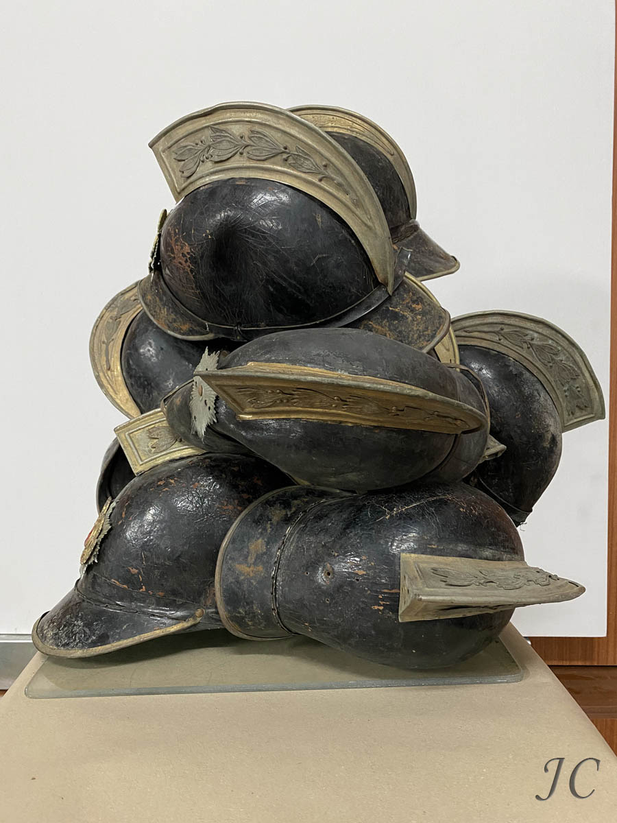 The artwork "Helmets I" is inspired by the fragments of the Greek Fire Brigade history. How we deal with the past, today. Protective headgear, fire helmet was and still is a defensive weapon for the firefighter. The artwork explores the dialogue between the protective "weapon" and the concept of the invisible "hero". These worn-out souvenirs as ruined items do not require anything from anyone. A momentary thought is enough to activate the memory, a tribute to the fighting firefighter. This technological achievement is thus transformed into a work of art and the installation highlights the following: