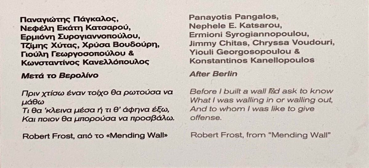 Nephele E. Katsarou, Yiouli Georgosopoulou, Jimmy Chitas, Criscia Voudouri, Ermioni Syrogiannopoulou, Konstantinos Kanellopoulos. Before I built a wall I’d ask to know what I was walling in and walling out, and to whom I was like to give offense. (Robert Frost, from “Mending Wall”).