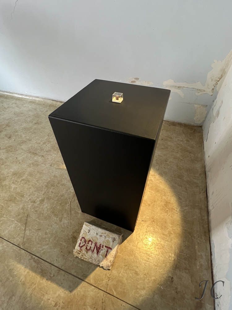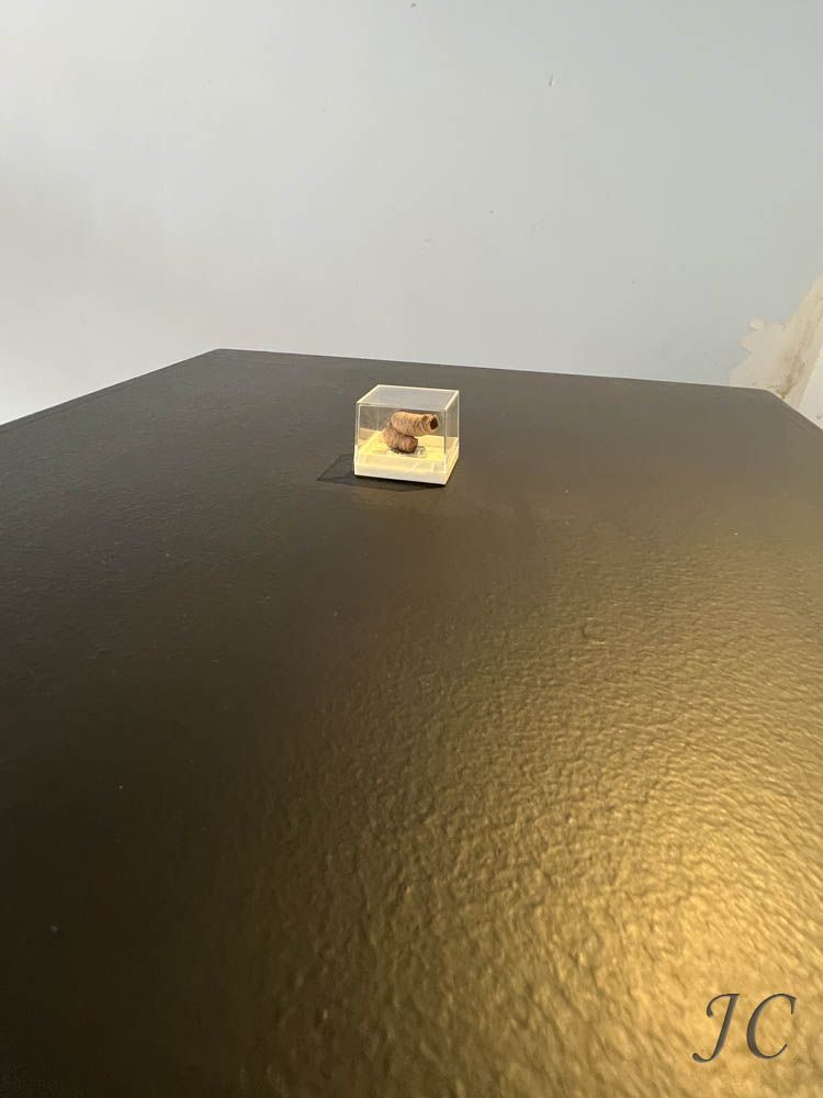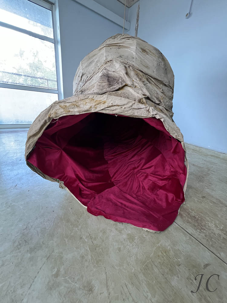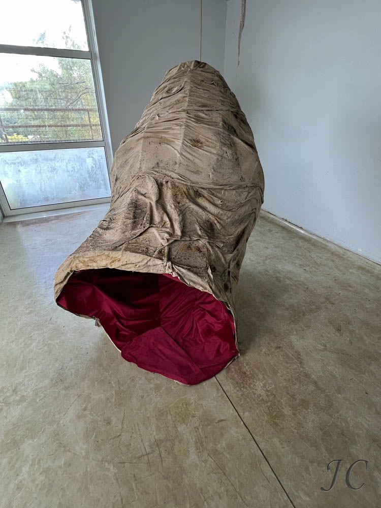 Enclosure and protection area. Sac in which the new being is transformed, the nymph into a bloomer. Mud, as a building material but also synonymous with slander, immorality, filth, corruption, forfeiture, decay. By association and experientially, the artist attempts to analyze the unexpected ecological relationships that develop in urban environments. How man, through what he experiences, takes refuge in his inner world, in his well-protected "cocoon", away from anything that harms him psychosomatically.