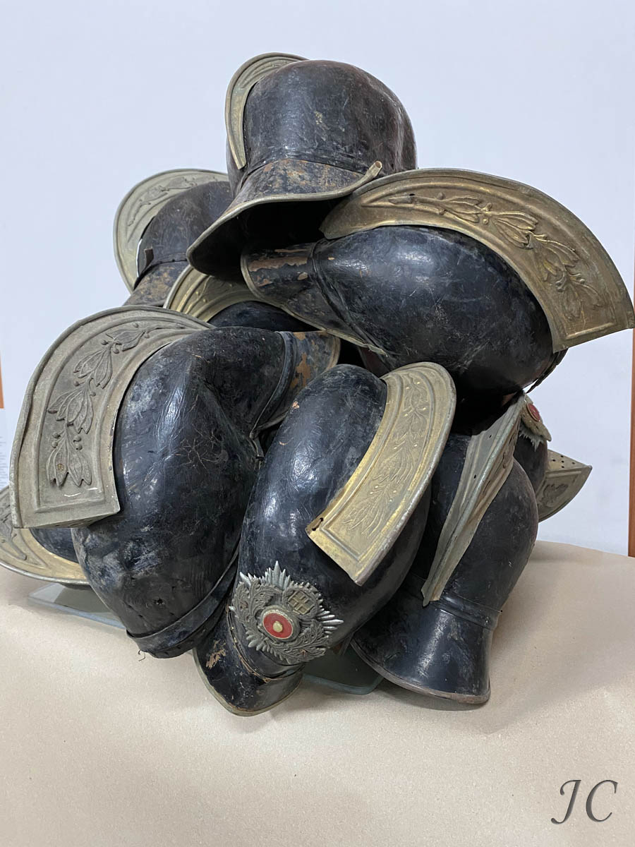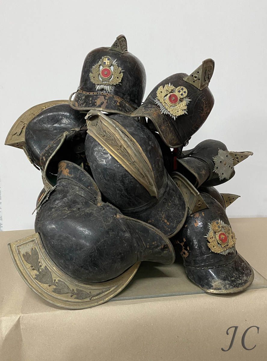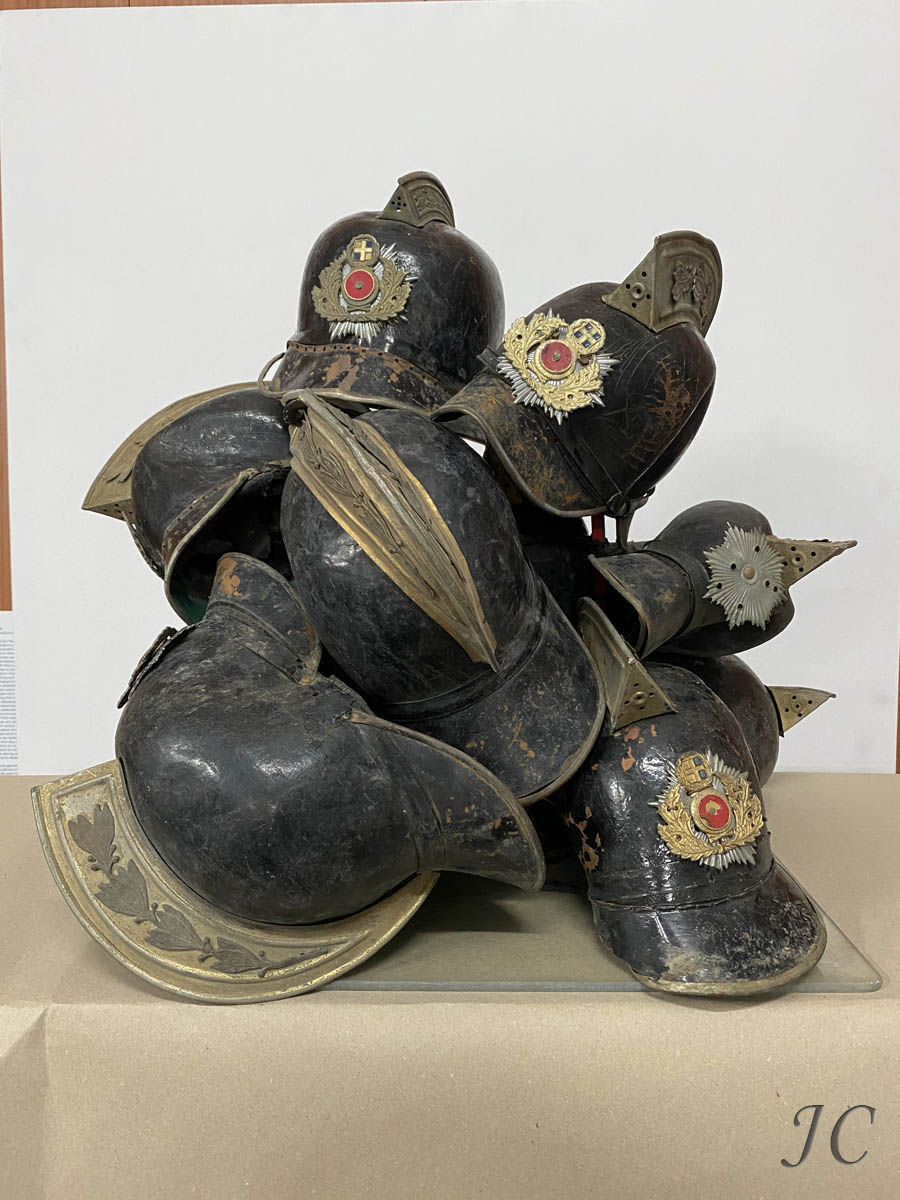 The artwork "Helmets I" is inspired by the fragments of the Greek Fire Brigade history. How we deal with the past, today. Protective headgear, fire helmet was and still is a defensive weapon for the firefighter. The artwork explores the dialogue between the protective "weapon" and the concept of the invisible "hero". These worn-out souvenirs as ruined items do not require anything from anyone. A momentary thought is enough to activate the memory, a tribute to the fighting firefighter. This technological achievement is thus transformed into a work of art and the installation highlights the following: