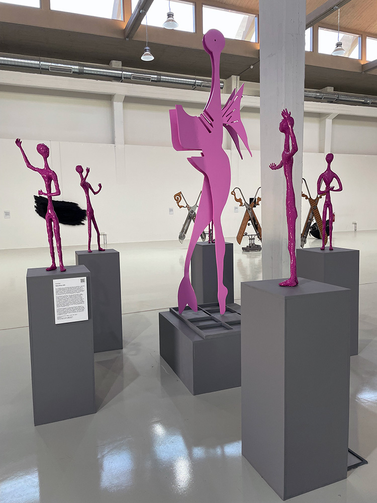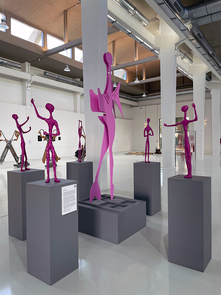 In the installation Suitors, five purple anthropomorphic units - with a post-human aesthetic tendency - revolve around a hybrid figure: the “Sacred Feminine”. The visual topology inverts the iconography of Penelope, as it is not about the female as an object of desire, but about the body of inherent unity that establishes order through its immobility. A not-so-innocent Penelope, in the pink hue of the implicit resistance found in the temporary withdrawal of the sun, in a field where the fever of memory resists the trauma of loss. The purple suitors, carriers of fluctuating entropy, imposition without devotion and demonstration of power without roots, express the sophistication, the arbitrariness of the ritual, recording the model of destabilization that attempts to break through the center.